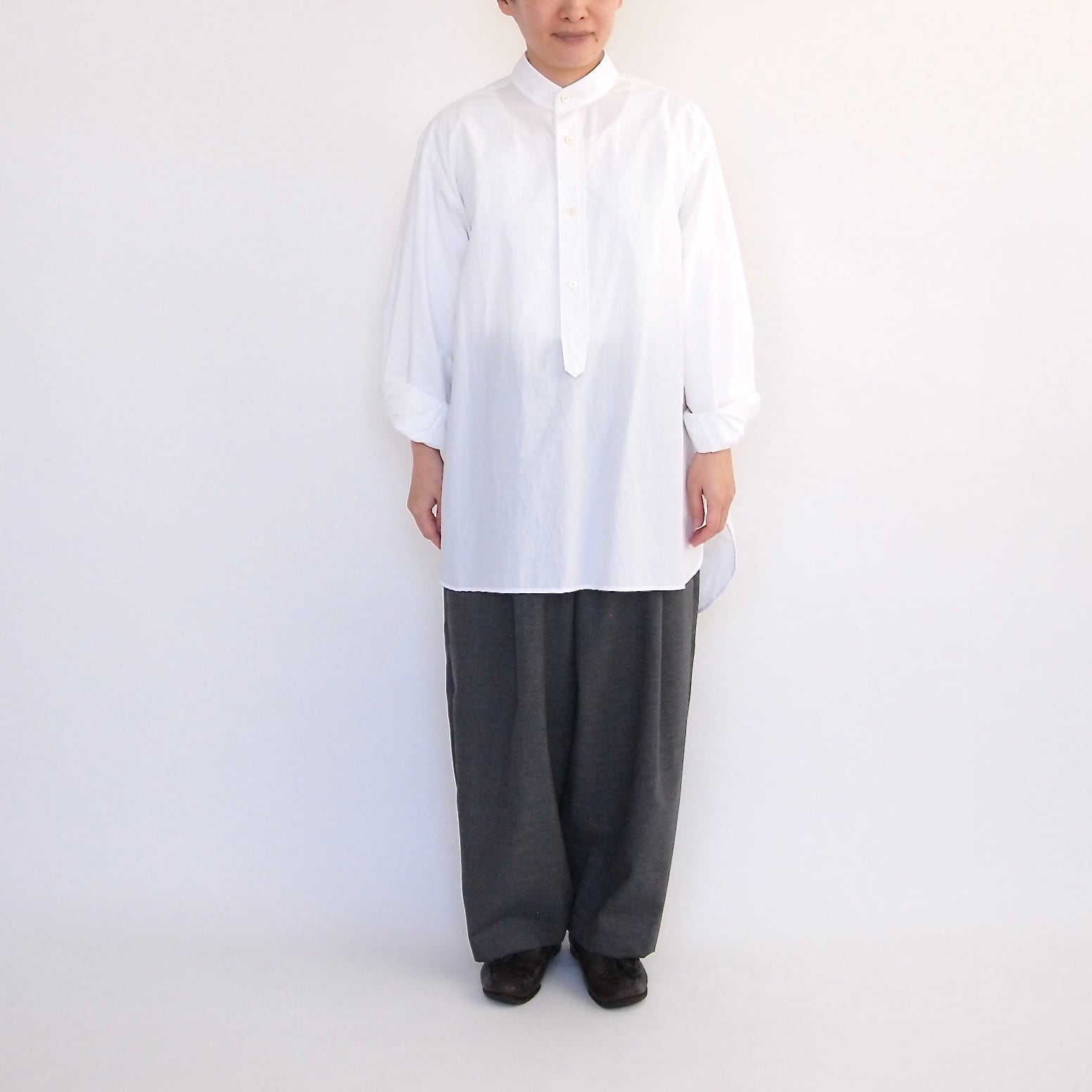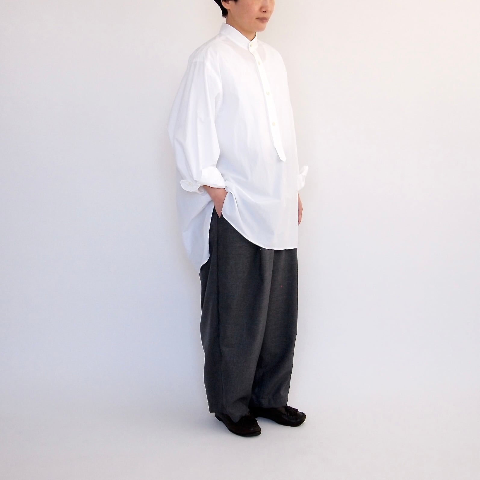 □繊維が細く柔らか、軽さもあり、さらりとした肌触りが特徴のエクストラファインウールを使用。ウールには吸湿性が備わっており、これから訪れる、梅雨、そして夏場でも蒸れにくい素材で快適さを維持できます。そして、エクストラファインウールならではの毛羽立ちのない綺麗な表面、シワになりにくさ、生地のドレープ感がパンツのシルエットの特徴を引き出してくれています。またtop糸(複数の色糸を撚って1本の糸にしたもの)を使用しているので、ベタな色目ではないところにも一目置ける生地です。