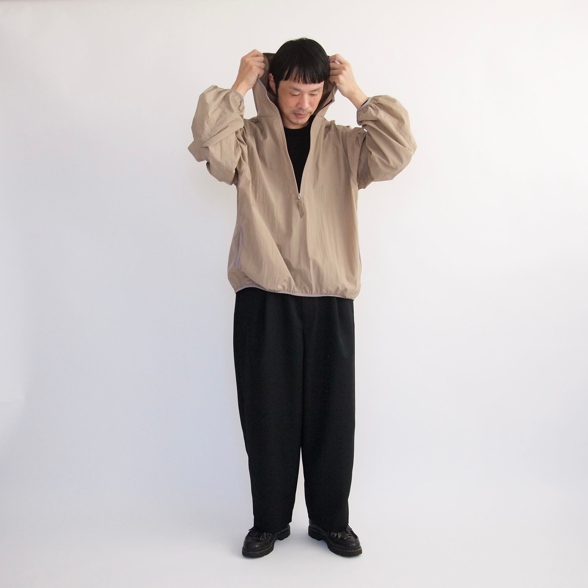 最近はウールのパンツもつくっています。(保温性や吸湿性、素材の特徴としても散歩くらいにはとても良いです)half zip yakkeはそれにも合わせるものをと考えつくりました。