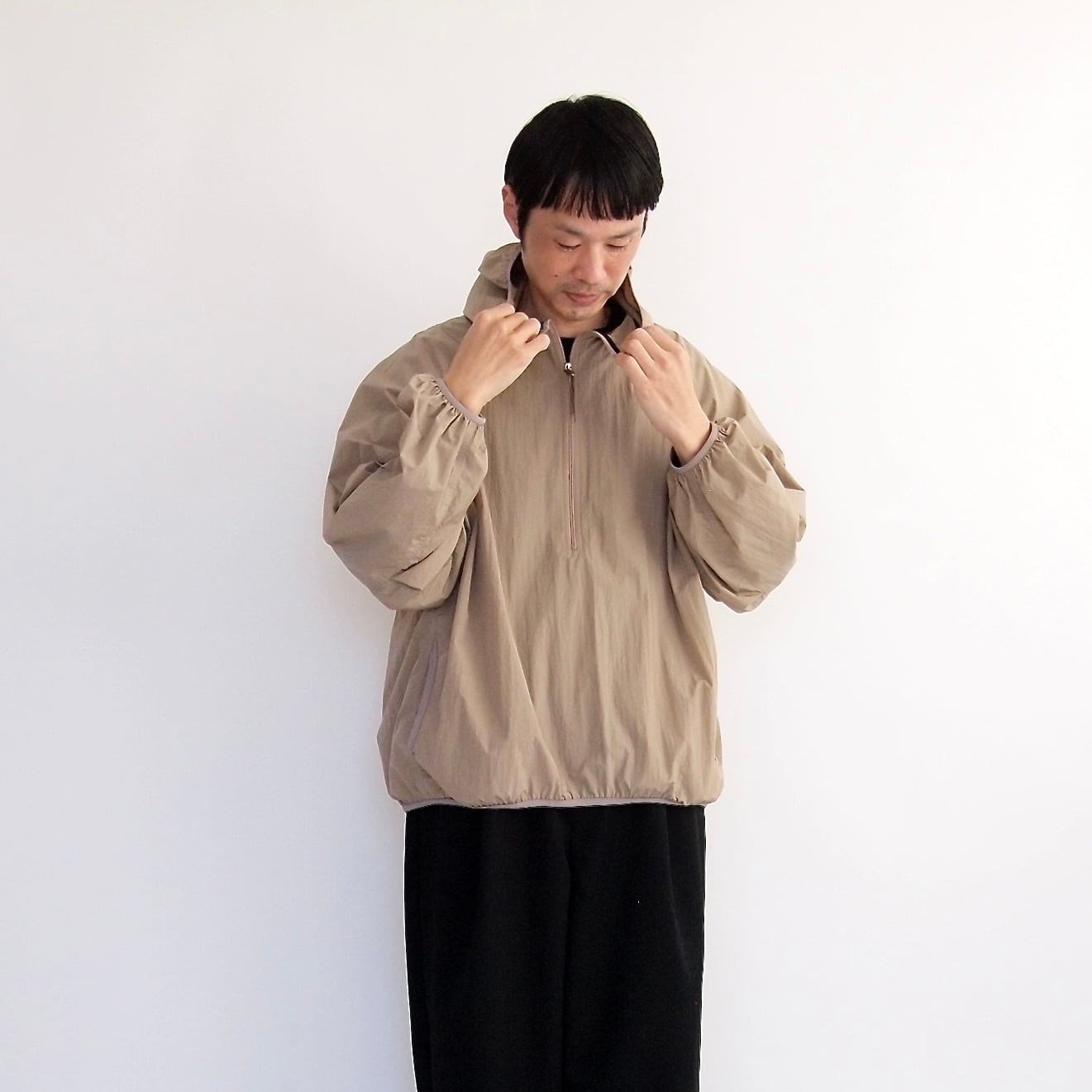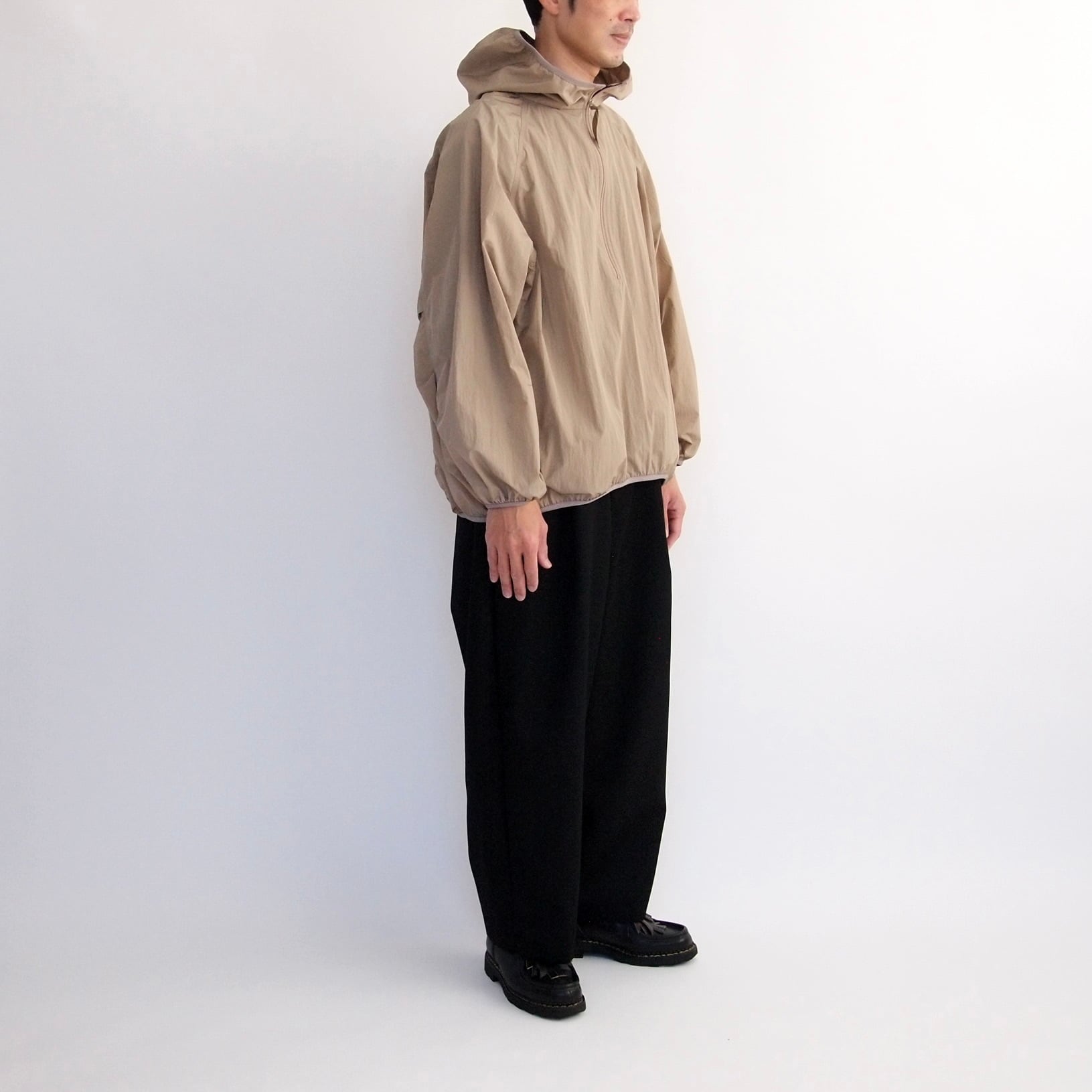 □フード、ハーフジップ仕様、袖口/裾/両脇ポケット/フード周りストレッチテープ始末、ラグランスリーブ、肘部分にはタック、背中部分タック