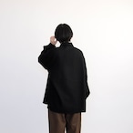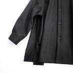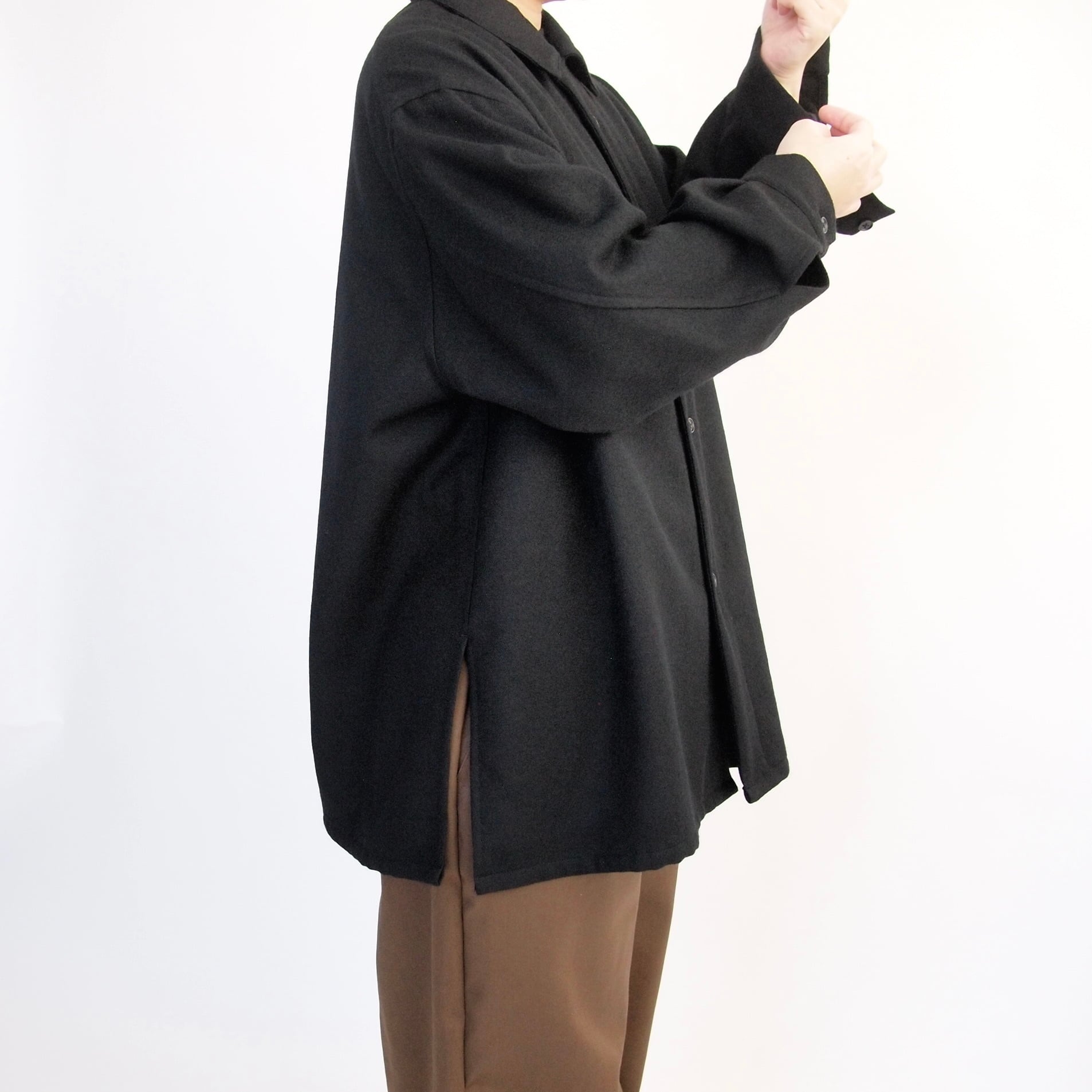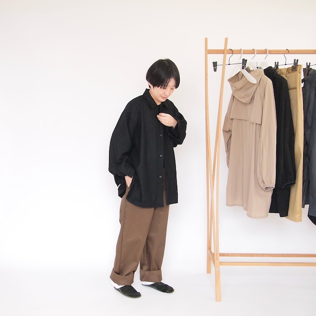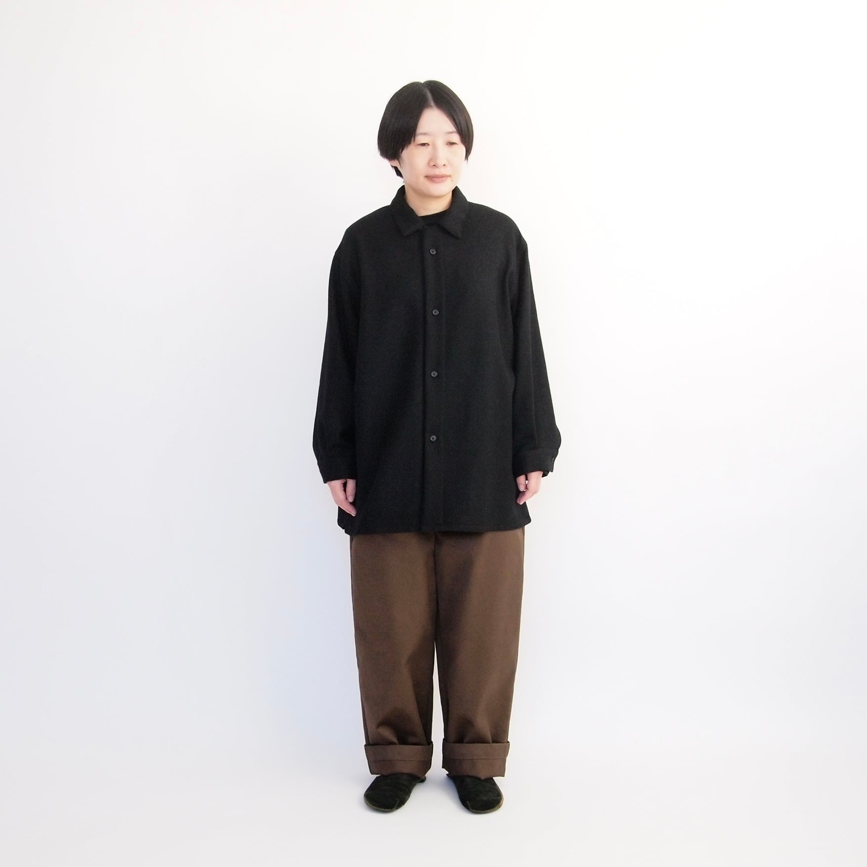 □メリノウール生地本来の良さを損なわない様、シンプルなシャツ型のジャケットをつくりました。オーバー過ぎず、コンパクト過ぎず、季節の進み具合によって、アウターとして着られる時期から、コートの下に着ることまで想定したサイズ設定です。メリノウールの流れるようなドレープ感を邪魔しない様、横に走る生地の切替は避けることで縦に落ちる生地の着心地の良さを感じていただけます。そしてパンツのポケットへのアクセスがしやすいようスリットは深めに設定しました。