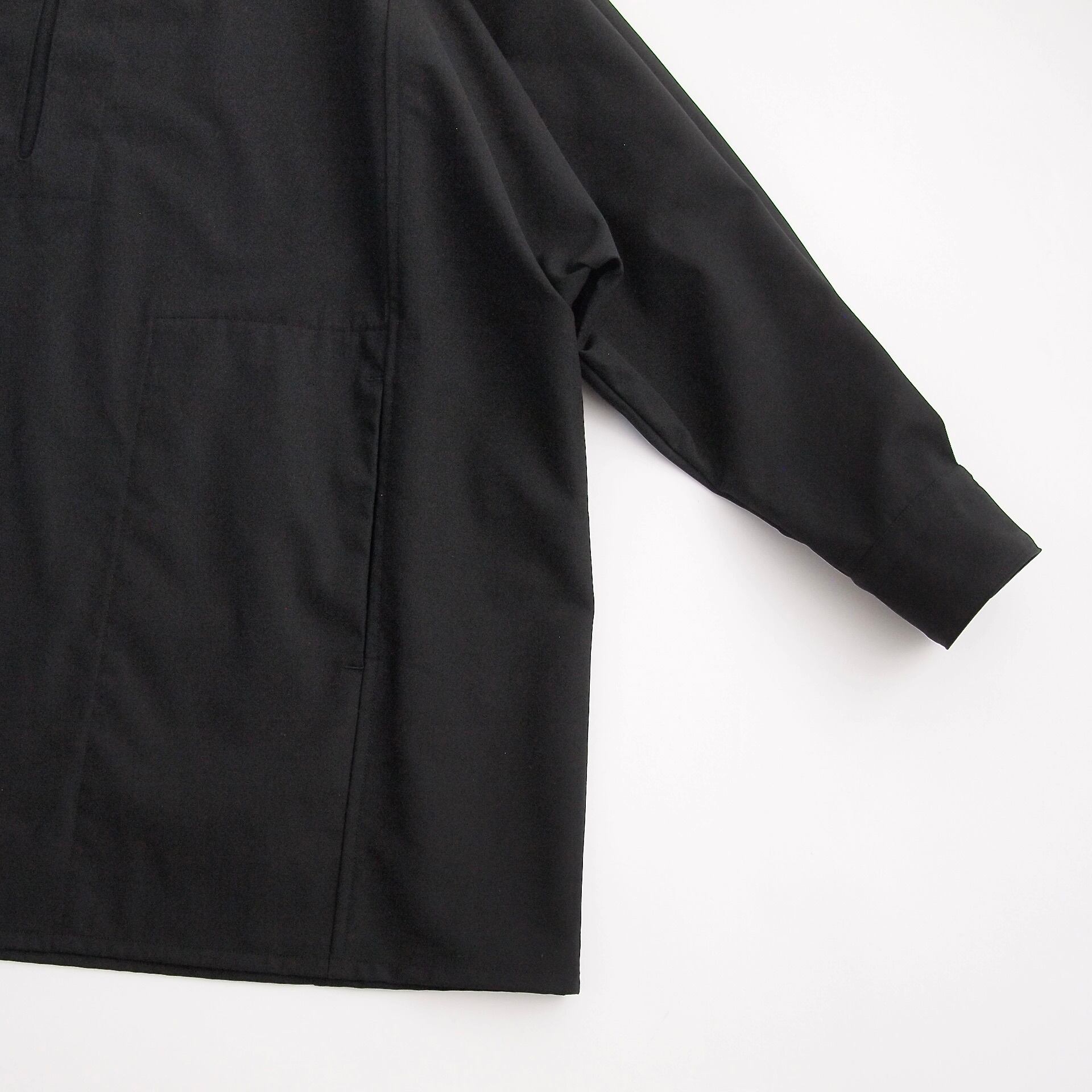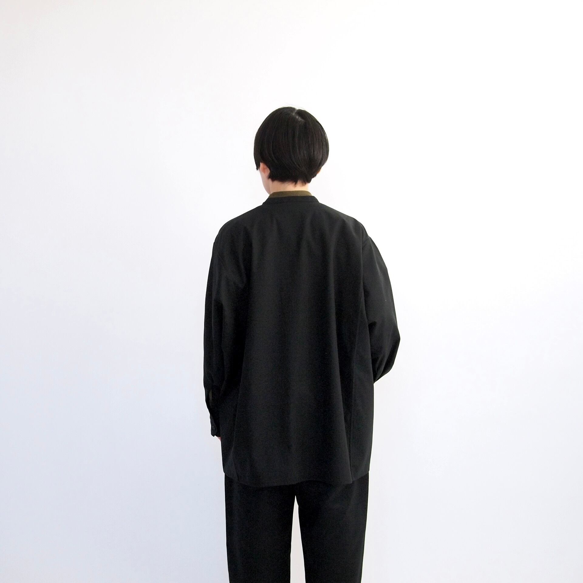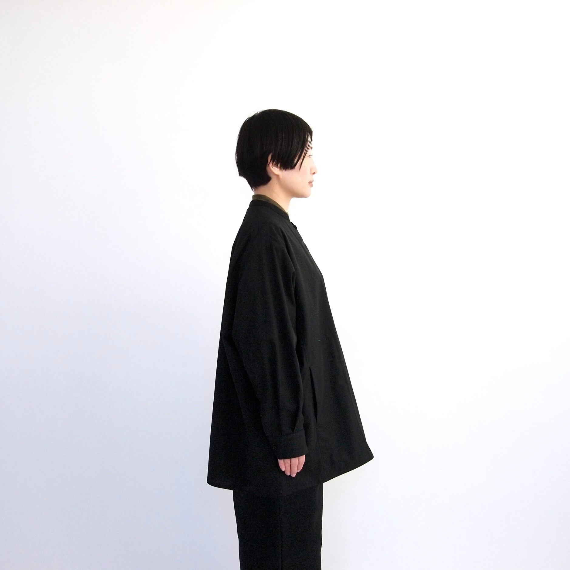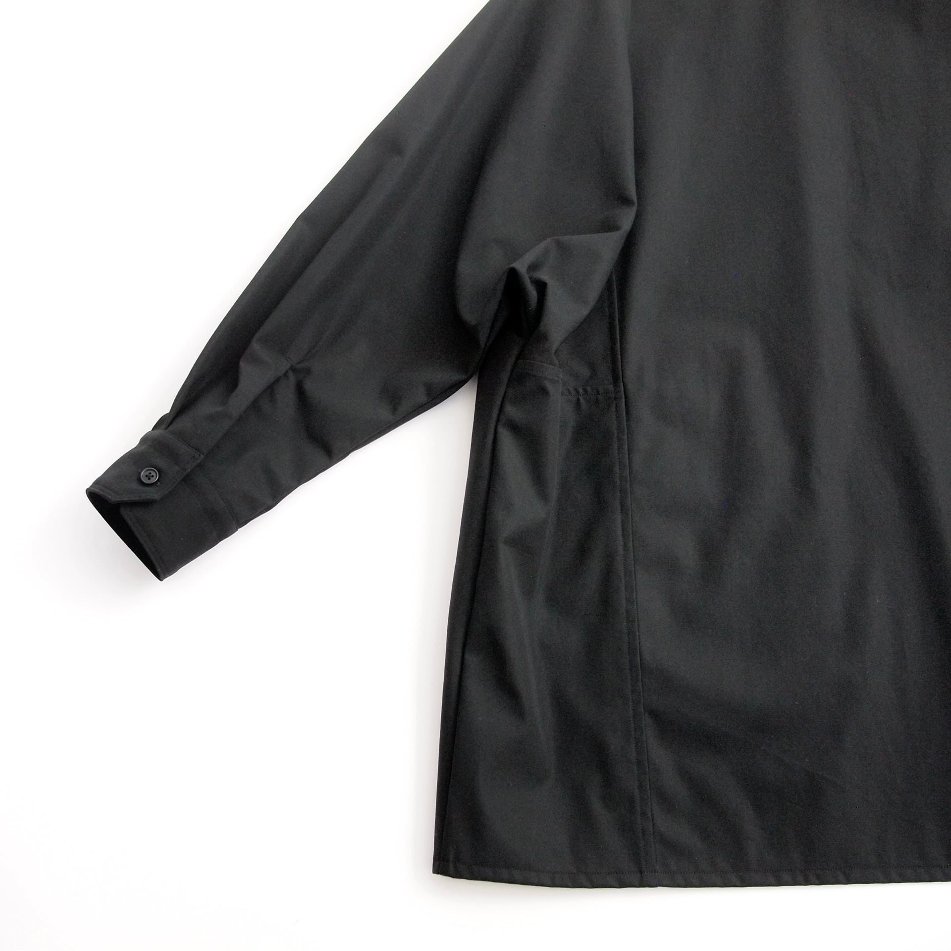 この生地には、それに特殊な加工を施すことで、体に優しく沿うような優れた滑らかさと、合繊のようなわずかな反撥感を持たせたことが特徴の清涼感をもった生地に仕上がりました。一つの加工を施すことで、マットなブラックとの違いがより鮮明に前面に出てくること、また、それが単なる妖艶な艶やかさではなく、とても身近な清涼感として昇華されているところに強い魅力のある生地です。