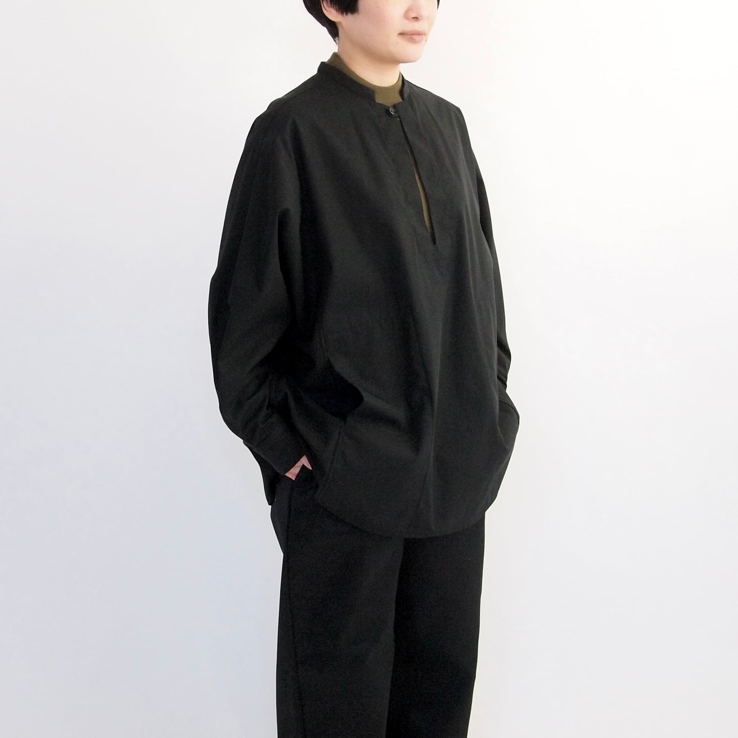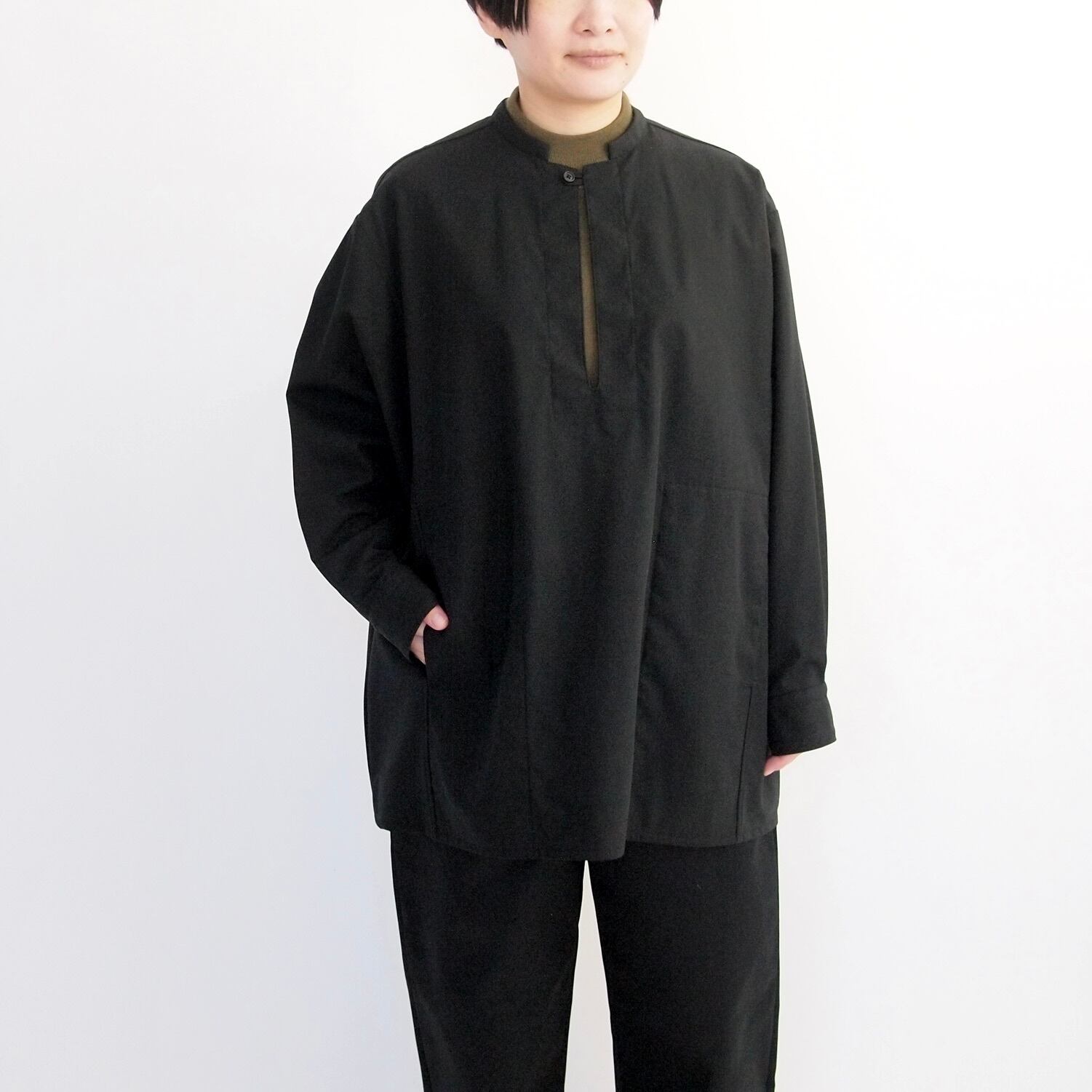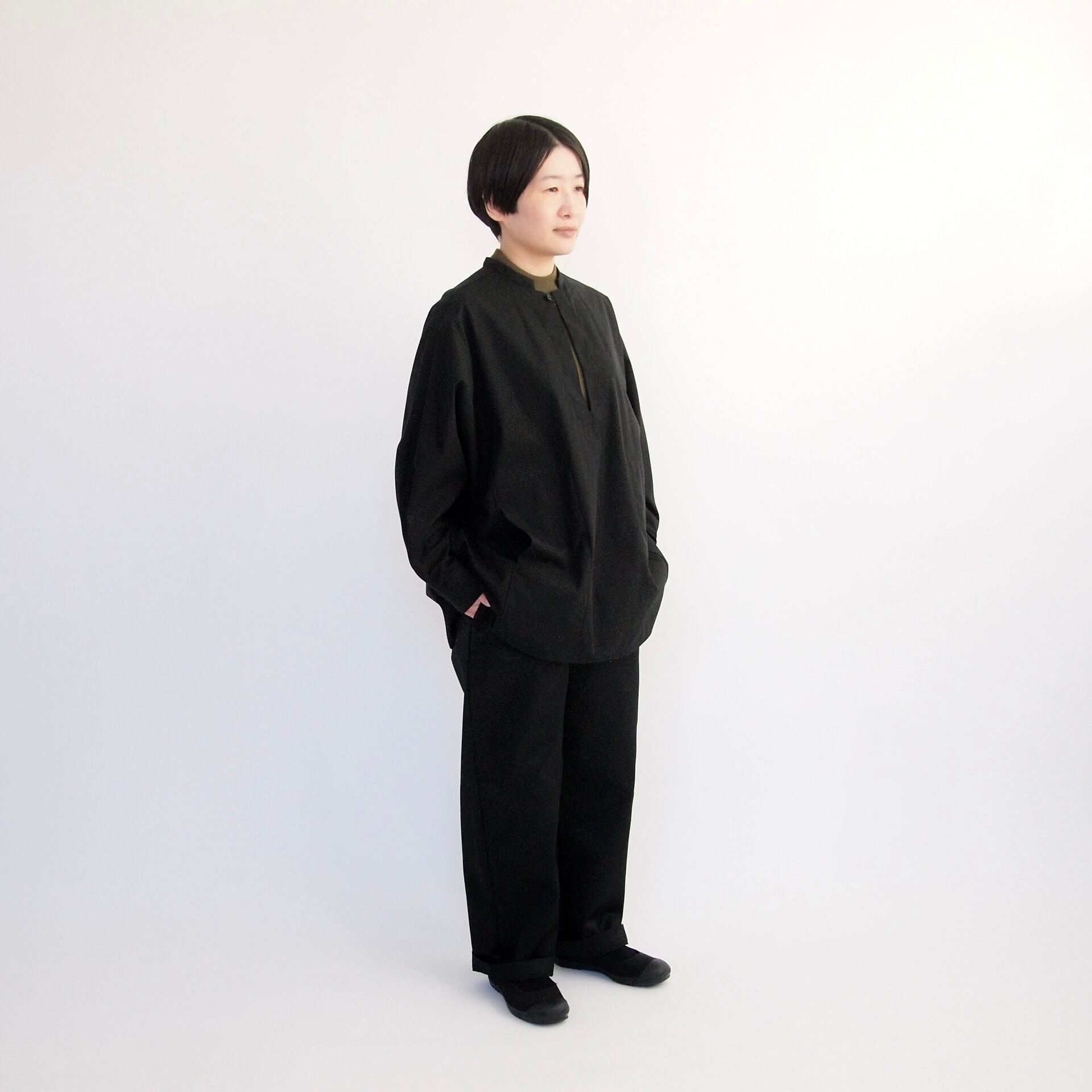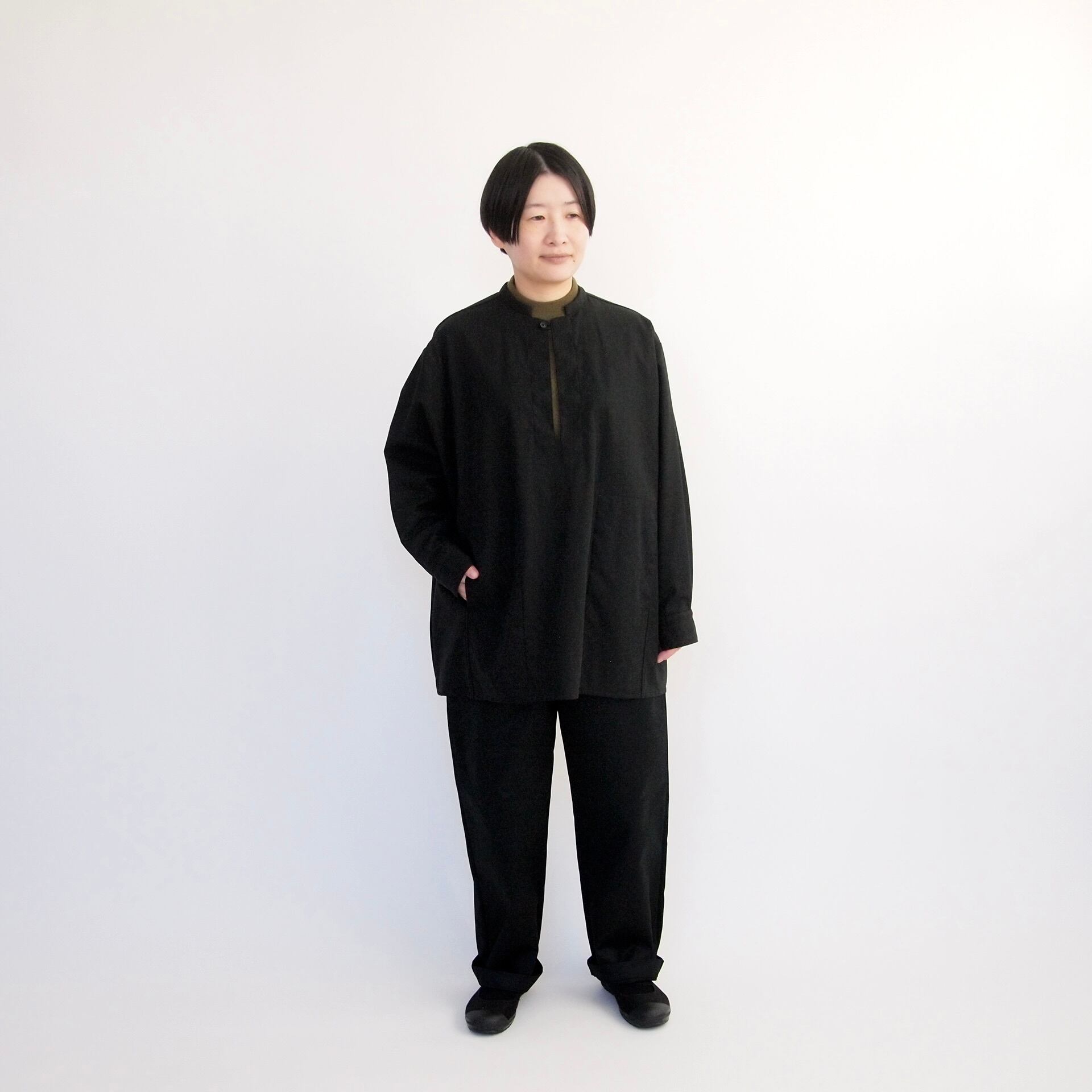 □所謂ヴィンテージのワークウェアに見られるようなメンズ的な力強いワークシャツではなく、でも、気持ちの上ではそのような空気を含ませた女性的なワークシャツを構想してつくりました。