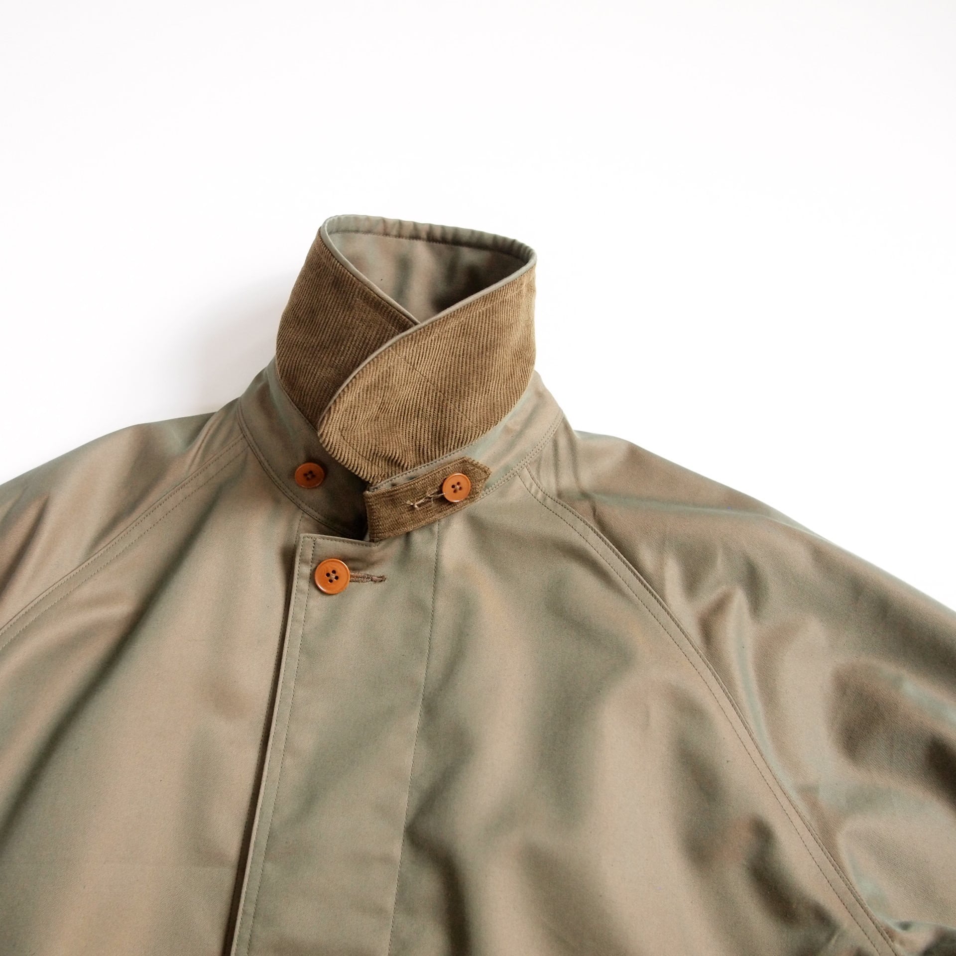 冷え過ぎる事のないよう、襟裏、台襟裏、両脇ポケットの袋布、袖口裏、フラップ 裏など、要所要所にはコーデュロイを使用して厚みを出しています。首元にはチンストラップをつけ、冷たい風の侵入を防ぐことができます。使用しない時は、留める側の反対にしまうことの出来るボタンをつけています。(画像参照)