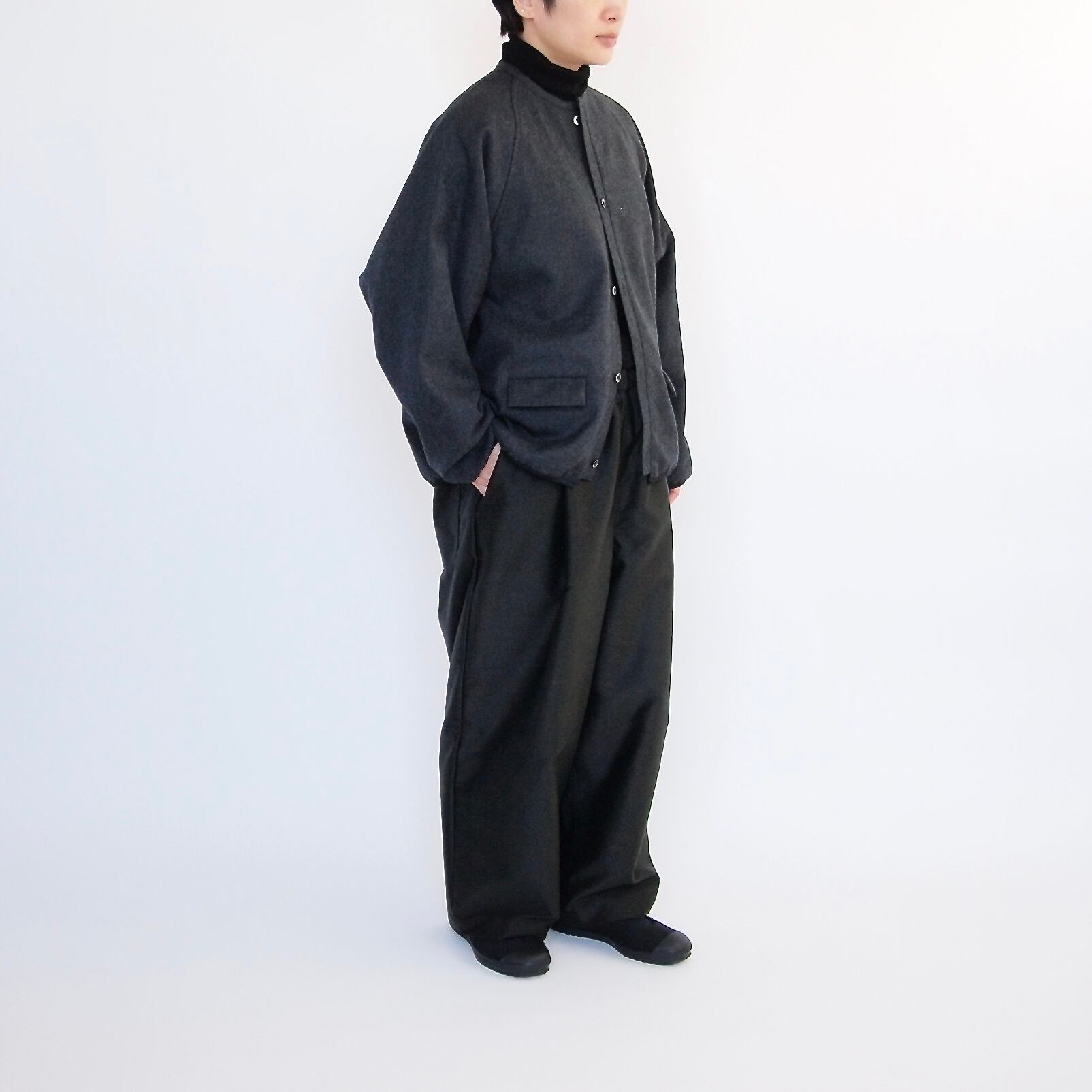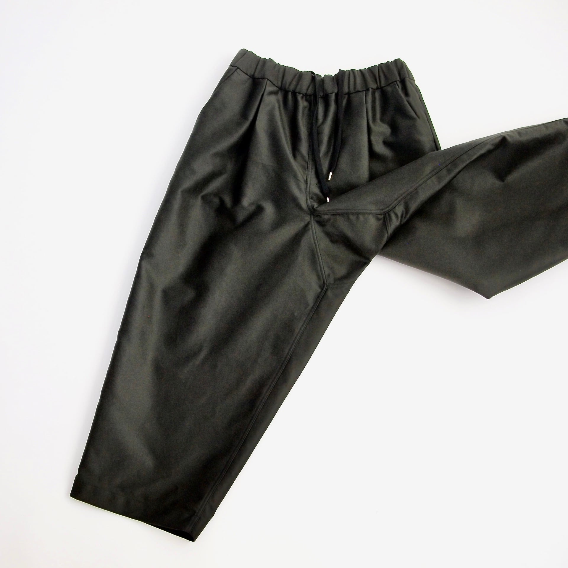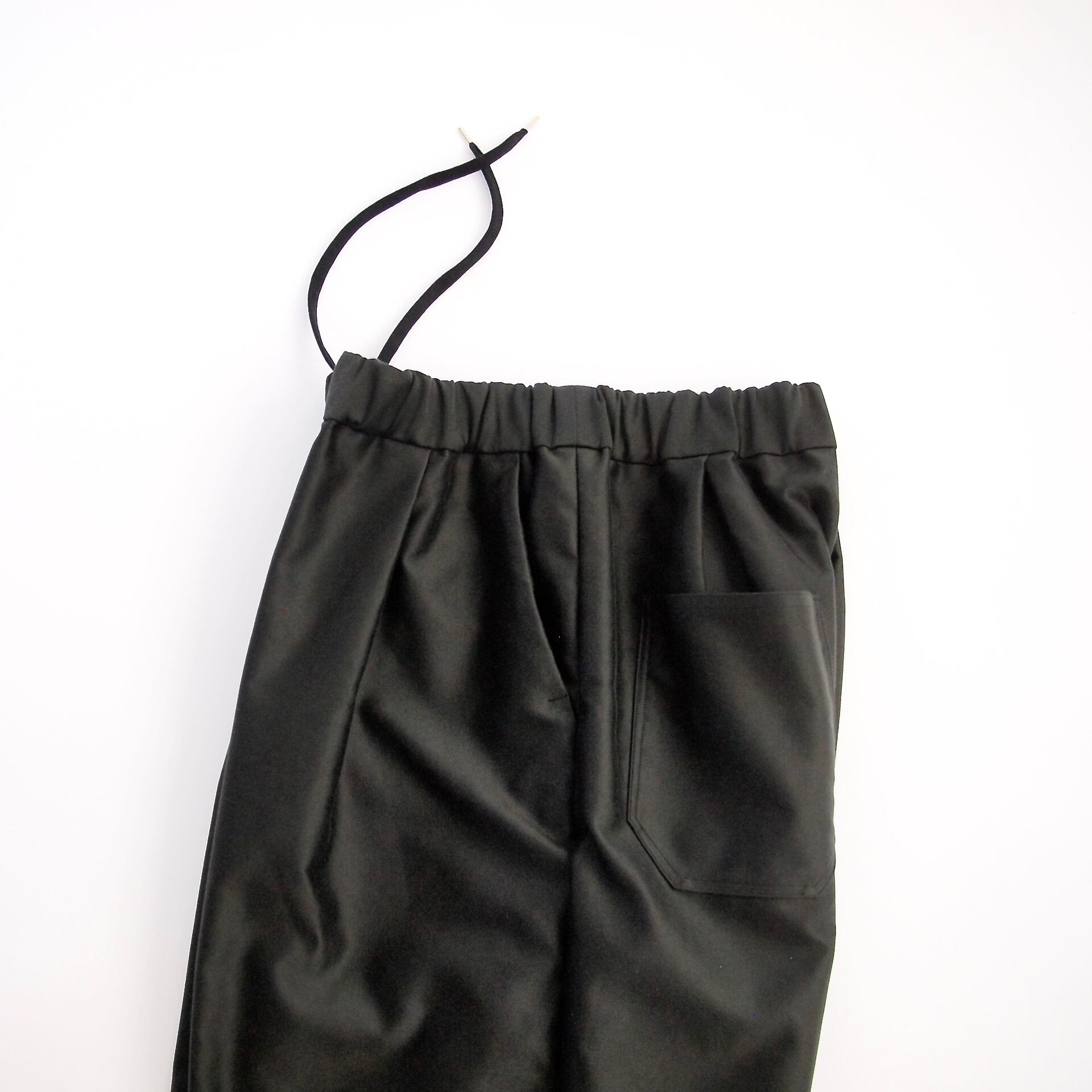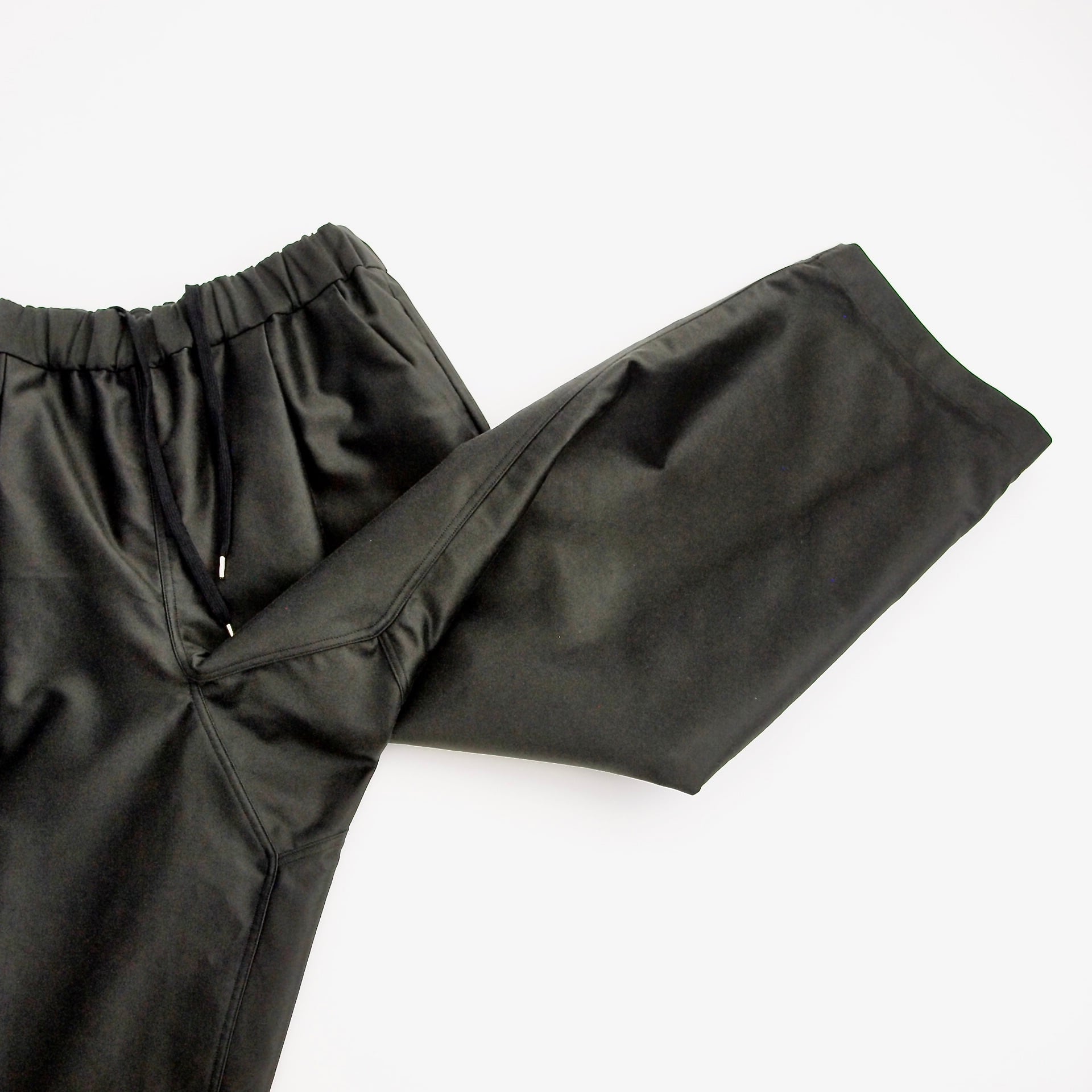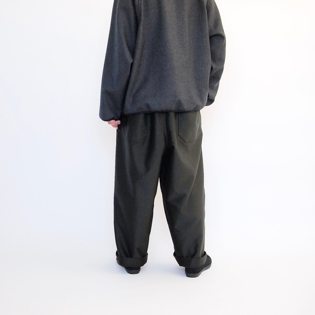 □ウェストはぐるりドローコードとゴムを使用。生地が脚にまとわりつくとこが少なく、体の自由度が高いことからシルエットはワイドな設定。前見頃、そして後見頃のタックは、太腿周り、ヒップ周りのゆとりを出す為に一役買っています。また後身頃の逆Vの字に入れたタックは、自然に後ポケットの口を広がらせる役割も担っており、物の出し入れがしやすいように設計。